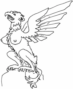 The Harpygriff is not called such without good reason. It has a head like a Gryphon (that is to say, the head of an bird/eagle, with the ears of a mammal/horse), as well as a lion's tail, a midsection like a human woman, and wings like an eagle in place of humanoid arms or animal forelegs. Thus, it appears to be a hybrid of Gryphon and Harpy in one body.