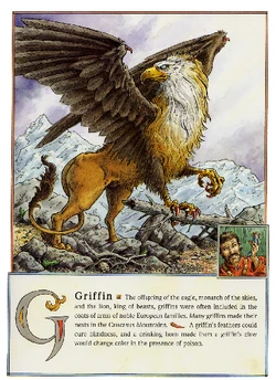 The Leogriff (or Leogryph) is an ancient beast from the sands of Egypt, the griffin has the body and hind legs of a lion. Its fur keeps it warm within the colder months and helps keep sun rays off their skin. The griffin has giant bird-like wings that let it fly through the sky. It has the fore-front of a bird (mostly an eagle) which gives it keen eye sight and a powerful hearing so it can hunt its prey even better.