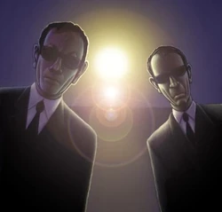 Though, this is not to say that the Men in Black possess no superhuman powers. Many speculate that, if they are not human, they achieve a human appearance through adept Shapeshifting, or through intelligence high enough to devise disguising, voice mimicking, language assimilation technology and undoubtedly much more.